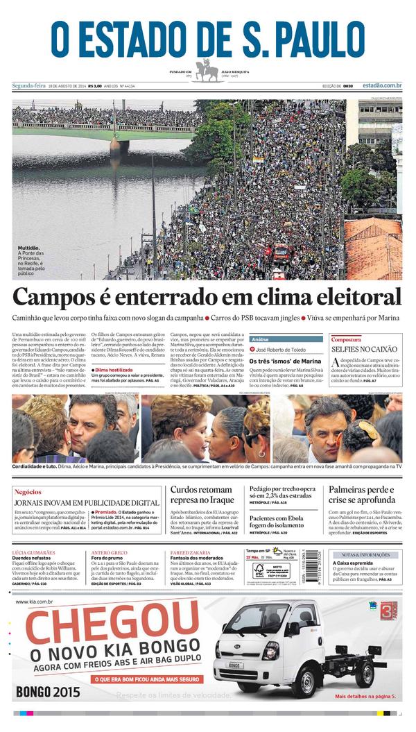 Capa de hoje: Campos é enterrado em clima eleitoral