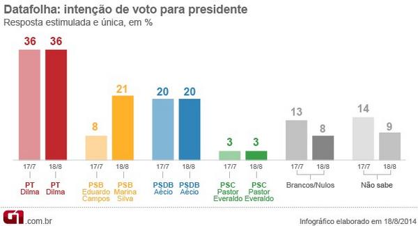 Dilma tem 36%, Marina, 21%, e Aécio, 20%, diz pesquisa Datafolha